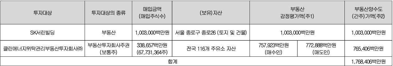 SK가 최대주주인 만큼 SK관련 부동산을 보유하고 있습니다. SK서린빌딩과 SK주요소 116개를 가지고 있습니다. SK서린빌딩은 SK이노베이션과 계열회사, SK E&S등이 사용하고 있습니다. SK서린빌딩은 연간 임대료는 약 392억 원입니다.
