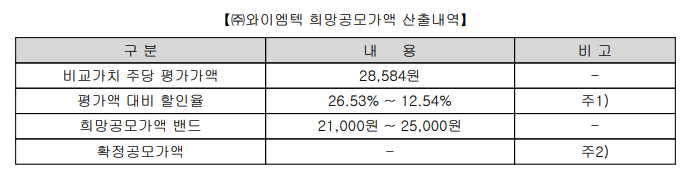 와이엠텍도 상반기 당기순이익을 2배하여 적용하였습니다. 여기에 평가액 대비 할일율 26.53% ~ 12.54%를 적용하여 21,000원 ~ 25,000원의 공모가가 산정되었습니다.