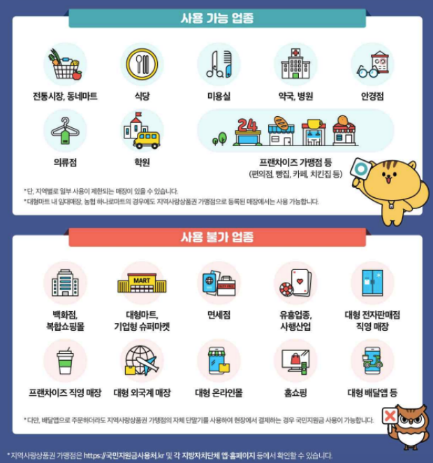 지급 받은 코로나 상생 국민지원금은 지역사랑상품권의 사용처와 동일하게 사용이 가능합니다.