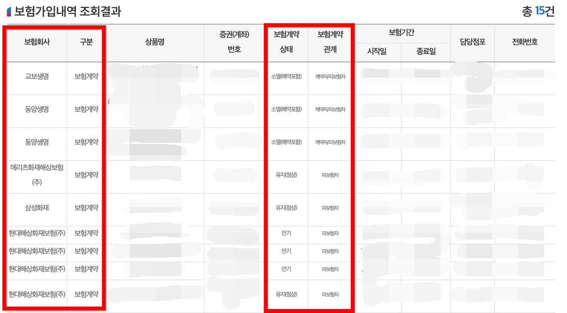 보험회사, 가입한 상품명, 현재 보험계약 상태를 볼 수 있습니다. 만기와 소멸(해약)된 거 역시 포함되어서 나옵니다.
