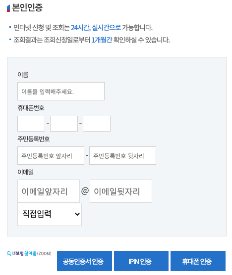 생명보험협회 내보험찾아줌 - 조회신청 > 본인인증