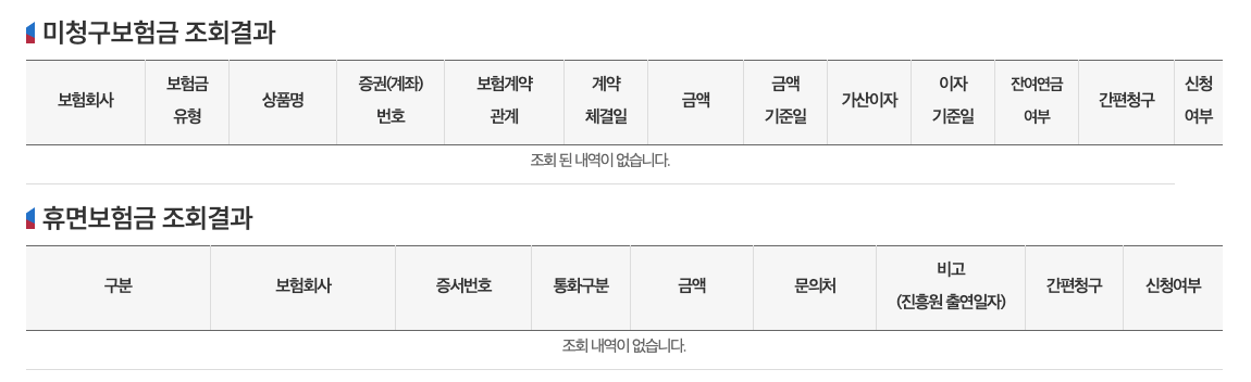 이제 우리가 필요함 숨은 보험금을 확인해야겠죠? 스크롤을 내려보면 '미청구보험금 조회결과', '휴면보험금 조회결과'를 볼 수 있습니다. 저는 조회된 내역이 없네요...
