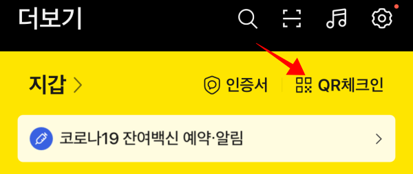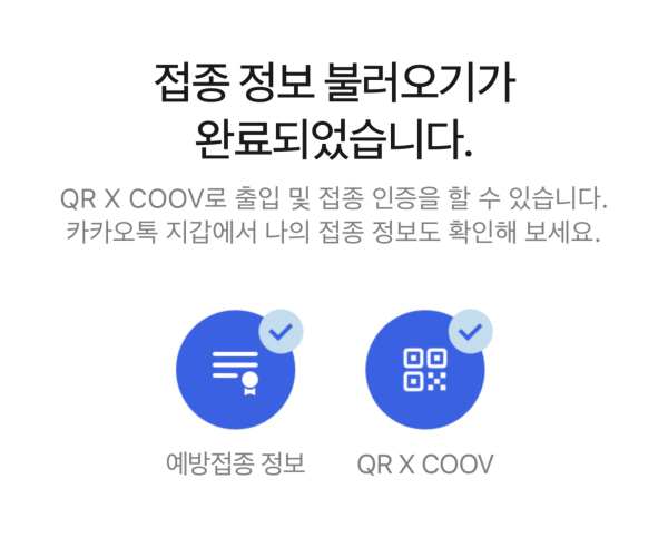 카카오톡 QR체크인을 누르면 하단에 예방접종 보기가 있습니다. 아직 접종 후 연동을 하지 않았으면 쿠브앱에서 증명서 발급 후 동기화 진행하시면 됩니다.