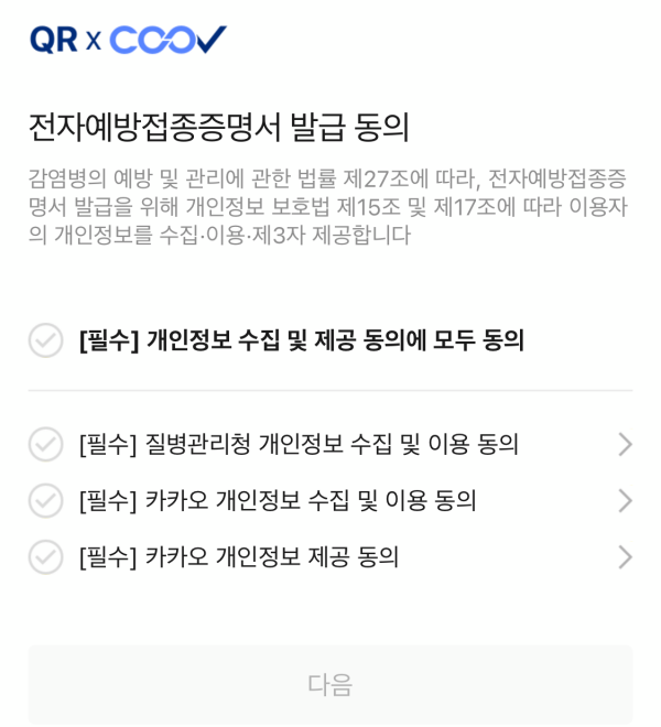 이제 기존에 전자 출입기록으로 사용하던 QR체크인과 연동해보겠습니다. 카카오톡, 네이버앱, 패스 앱을 통해서 백신 접종 여부 업데이트를 진행하면 기존 QR체크인에 자동으로 백신 접종 유무가 확인이 됩니다.