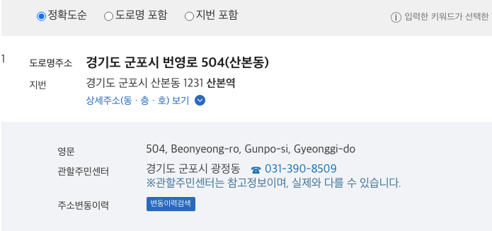 도로명주소 홈페이지의 경우 해당 주소를 도로명 주소로 알려주는 홈페이지인데요. 변환된 주소 정보와 관할주민센터 정보가 표시됩니다. 관할 주민센터는 참고정보라고 하지만 대부분 일치하고, 혹시나 틀릴수도있으니 해당 주민센터에 전화하셔서 여쭤보시면 됩니다.