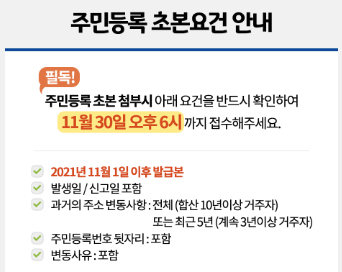제출서류 : 주민등록초본 ※ 신청일 현재 발급분, 발생일·신고일·변동사유, 최근5년(3년 이상 계속 거주) 또는 전체(합산 10년이상 거주) 주소변동이력, 주민등록번호 뒷자리 반드시 포함