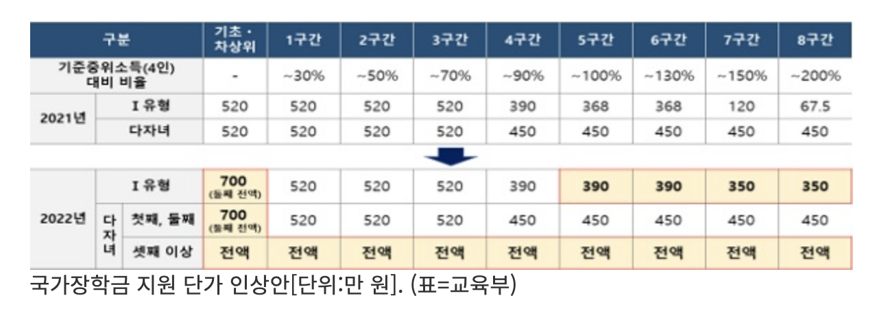아래표는 2022년에 변경된 소득분위별 국가장학금 지원 단가 인상입니다.