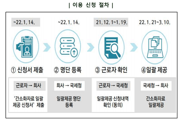 - 회사는 근로자가 일괄제공 신청시 해당 명단을 22년 1월 14일까지 홈택스에 등록.