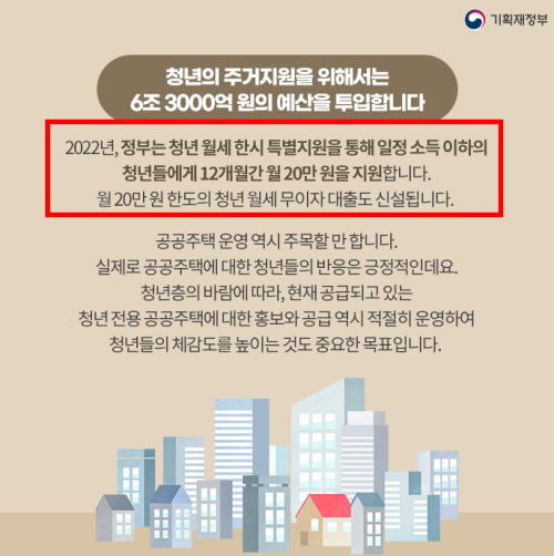2022년 정부 예산안이 발표되었습니다. 내년에는 청년의 주거지원을 위해서 6조 3,000억원이 투입 될 전망인데요. 2022년 정부는 청년 월세 한시 특별지원을 하기로 결정했습니다. 대상자는 일정 소득 이하의 청년이며 12개월간 월 20만원을 지원하기로 했습니다. 자세한 내용 같이 알아보겠습니다.
