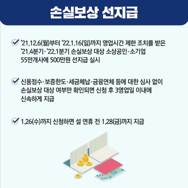 ✔ 21년 12월 6일부터 1월 16일까지 영업시간 제한 조치를 받은 업체 55만개사 대상 500만원 선지급
