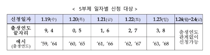 첫 5일동안에는 접속이슈 장애 방지를 위해서 1월 19일(수) ~ 1월 23일(일)까지 5부제를 실시하게 됩니다. 신청 대표자의 주민등록번호의 출생연도 끝자리 기준입니다.