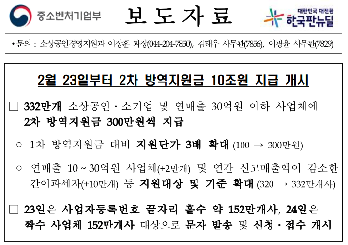 2월 23일 수요일부터 소상공인 2차 방역지원금 300만원이 지급이 됩니다. 23일 부터는 신속지급 대상자로 1차 방역지원금 지급 했던 DB를 통해 우선 지원 대상자를 선정하였습니다.