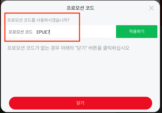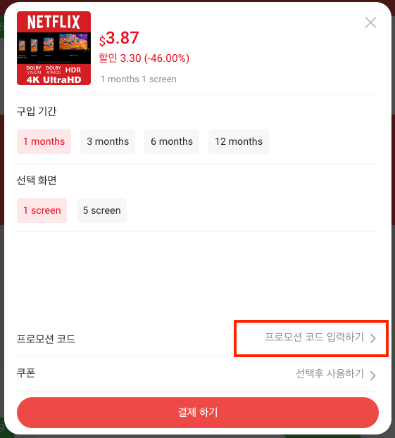구입기간을 선택후 프로모면 코드를 입력합니다.