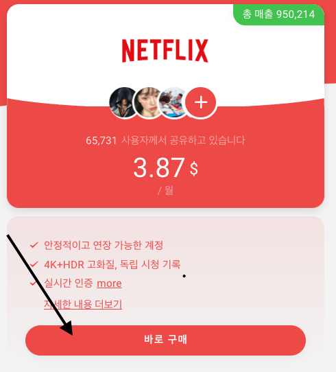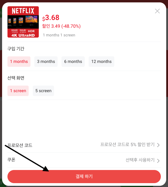 추가 할인되어서 $3.68달러에 넷플릭스 시청이 가능합니다. 12개월로 결제를 한다면 더욱 할인 된 가격으로 이용할 수 있습니다.