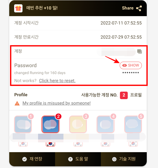 현재 구독중인 넷플릭스가 표시된 것을 볼 수 있습니다. 계정 시작시간과 만료시간이 표시되며 넷플릭스에 로그인 할 계정이 있습니다. 계정 옆에 복사 버튼이 있으며 비밀번호의 경우 SHOW 버튼을 누르면 표시가 됩니다.