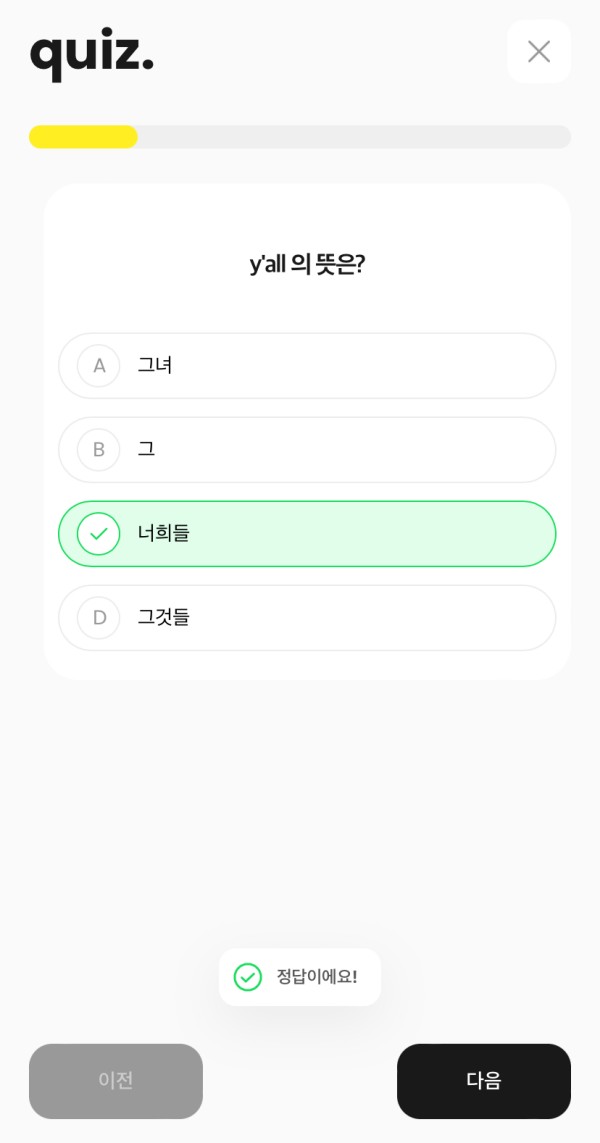 마지막으로 퀴즈입니다. 퀴즈는 굉장히 간단하게 단어들 체크로 구성되어 있습니다. 이렇게 한 사이클로 공부하니 연습도 많이 되고 복습까지 되서 기억에 오래 남더라구요