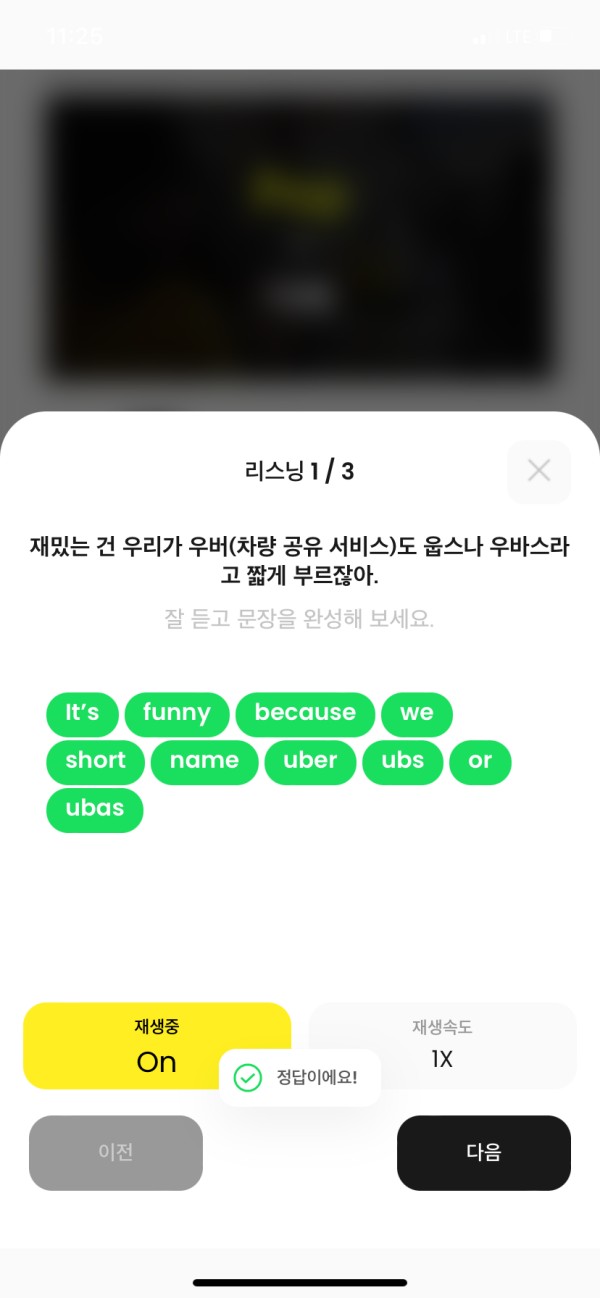 다음은 리스닝 단계입니다. 아까 영상의 문장들을 하나하나 들으면서 알맞게 배열합니다.