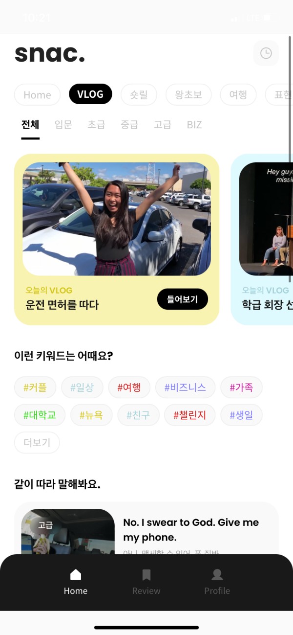 직장에 가서도 영어는 계속 필요해서 놓을수가 없는거 같아요 일할때도 그렇지만 여행가서도 유용하고 요즘엔 외국유튜브들도 재밌는게 많아서 영어 잘하고 싶다라는 생각은 계속 하게되는데요 그러던 중 스낵잉글리시 라는 어플을 알게 되었고 실제 외국인들이 쓰는 말로 공부를 할 수 있다하여 사용해봤습니다.