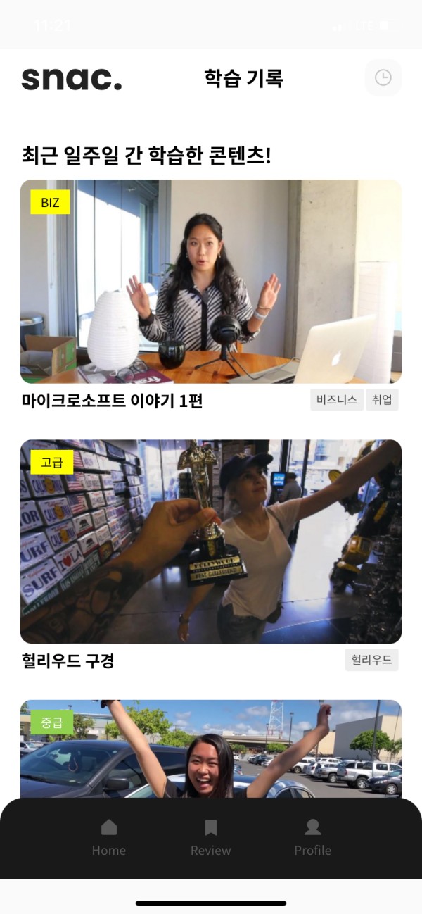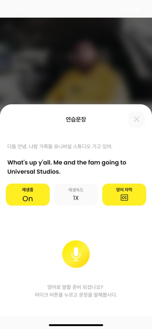 첫번째로 영상을 먼저 보고 자막도 봤다 안봤다 하면서 계속 따라말하기 연습을 합니다. 아래 마이크를 누르면 녹음이 가능합니다. 녹음하면서 내 발음도 다시 들어보면서 스스로 피드백이 되고 레벨 A,B.. 이렇게 알려주니 ㅎㅎ 더욱 열심히 해야겠다는 생각이 듭니다.