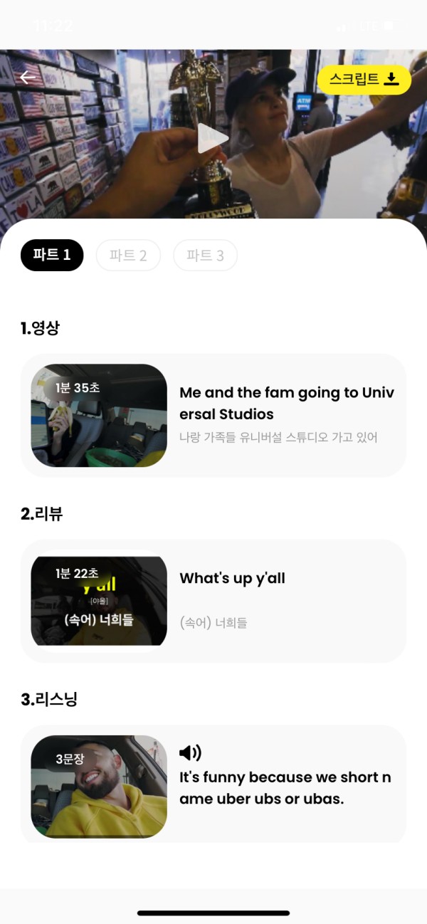 맘에 드는 영상을 하나 클릭하면 이렇게 공부할 순서가 나옵니다 오른쪽 상단에 스크립트도 있어서 원한다면 다운받아서 공부할 수 있게 정리되어있는점이 넘 좋았어요