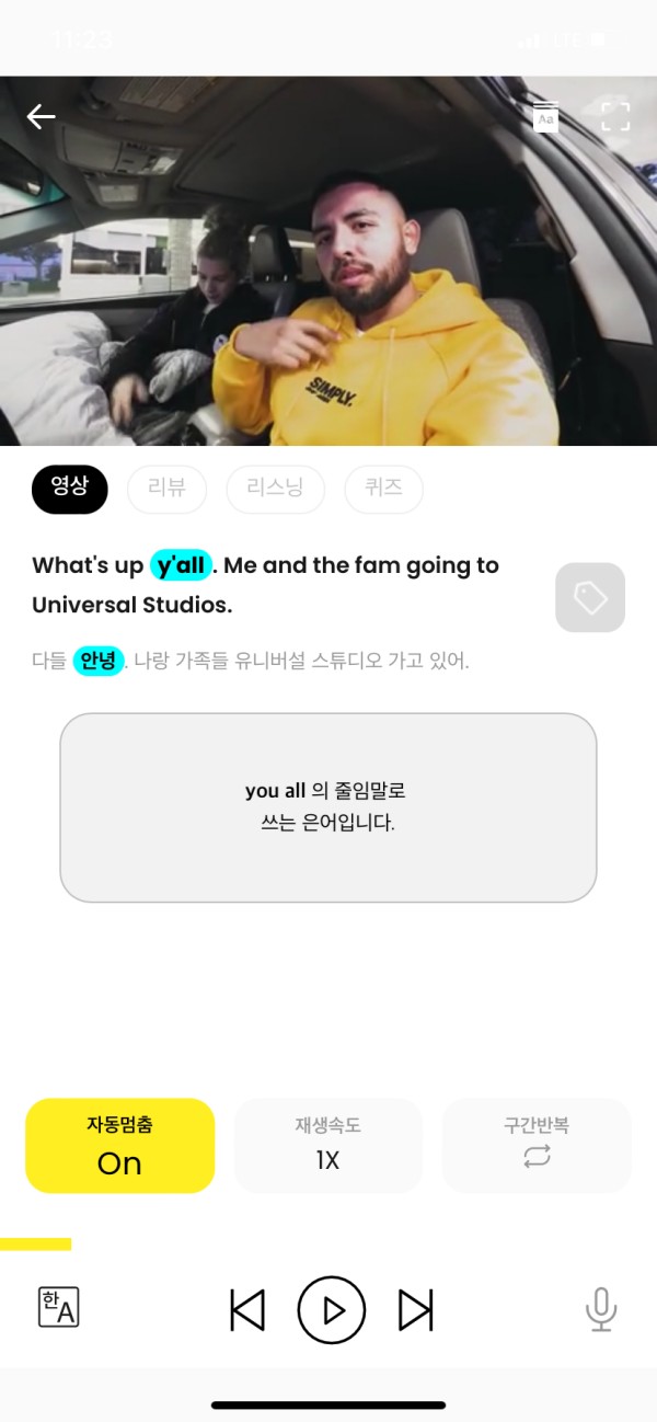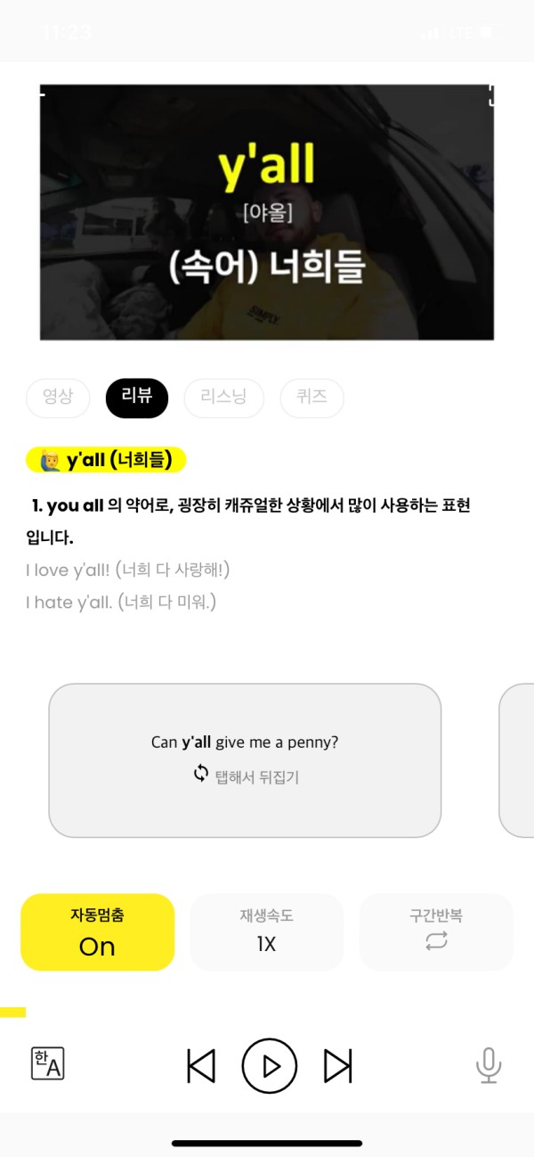 이 어플을 쓰면서 이런 상황에서 외국인들은 이렇게 말을 하는구나 ! 하며 알아갈 수 있고 그 문장들이 단락별로 나뉘어져 있으니 여러번 듣고 따라할 수 있는게 제일 큰 장점인거 같아요. 그리고 중간에 설명해주는 구간들이 있으니 이해에 도움이 되는것도 좋습니다. 종종 미드나 외국영상들을 보다보면 저 단어는 무슨뜻일까? 왜 굳이 여기에 쓰였을까? 라고 생각할 때가 많은데 그 점을 시원하게 긁어주는 느낌입니다.