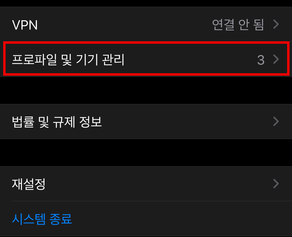 설정 -> 일반 -> 프로파일 및 기기 관리