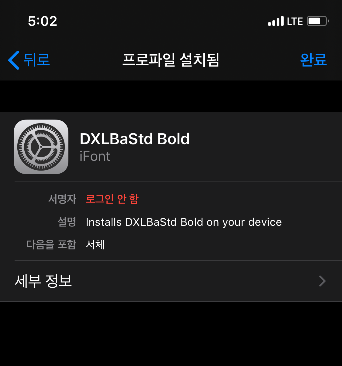 프로파일 및 기기 관리 탭에 들어가게 되면 다운로드된 프로파일 항목이 있고, 내가 받은 폰트임을 확인할 수 있습니다. 설치를 해줍니다. 정상적으로 설치가 되면 프로파일 설치됨이라고 표시가 되고 우리는 이제 해당 폰트를 사용할 수 있게 되었습니다.
