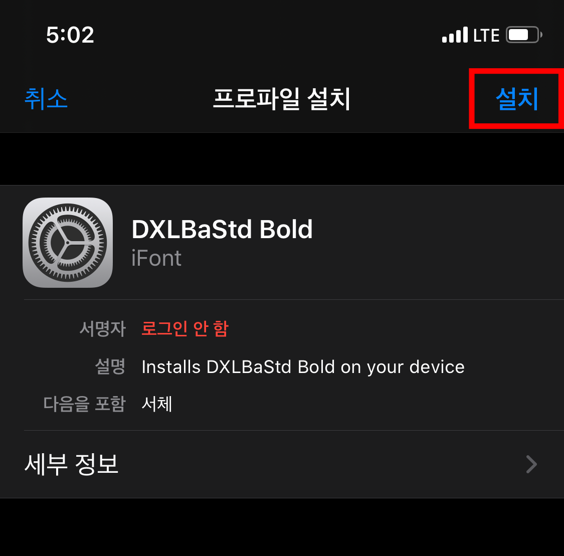 그러면 다운로드된 프로파일에 폰트가 있는 걸 볼 수 있어요. 프로파일을 설치해 줍니다.