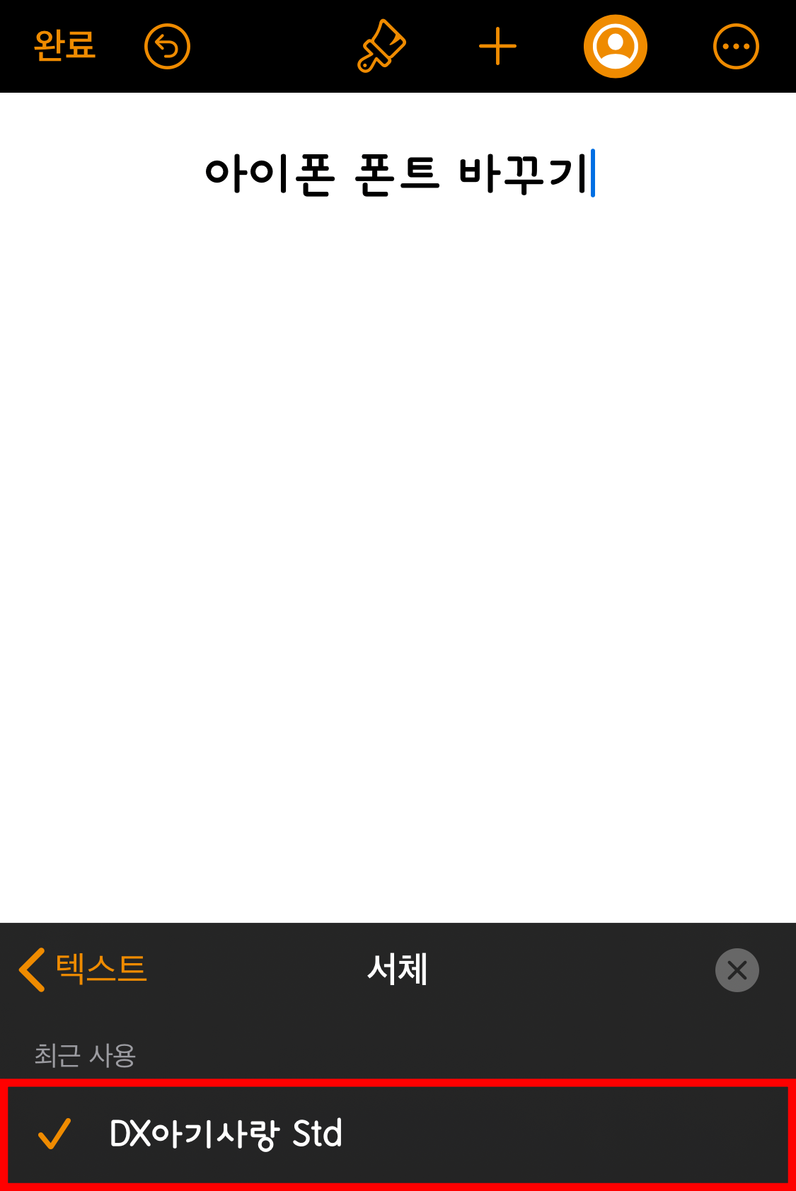 텍스트 변경 창에 보면 짜잔 우리가 받은 DX아기사랑 이 서체에 있습니다!!!