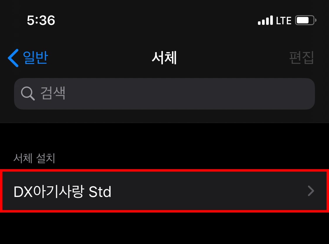 마지막 확인 아이폰 설정 -> 일반 -> 서체에 들어가면 좀 전에 설치한 아이폰 폰트를 확인할 수 있습니다. (추가적으로 iFont App에서 설치된 부분도 확인 할 수 있습니다. 아이폰 설정에서 이미 확인이 된다면 추가적으로 볼 필요는 없어요.)