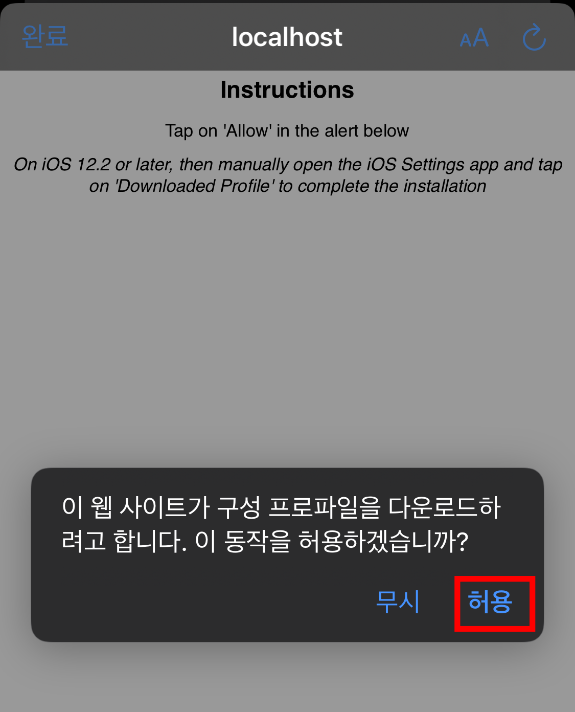 여기서 Install을 누르면 프로파일을 다운한다는 안내 창이 나옵니다. 허용을 해줍시다.