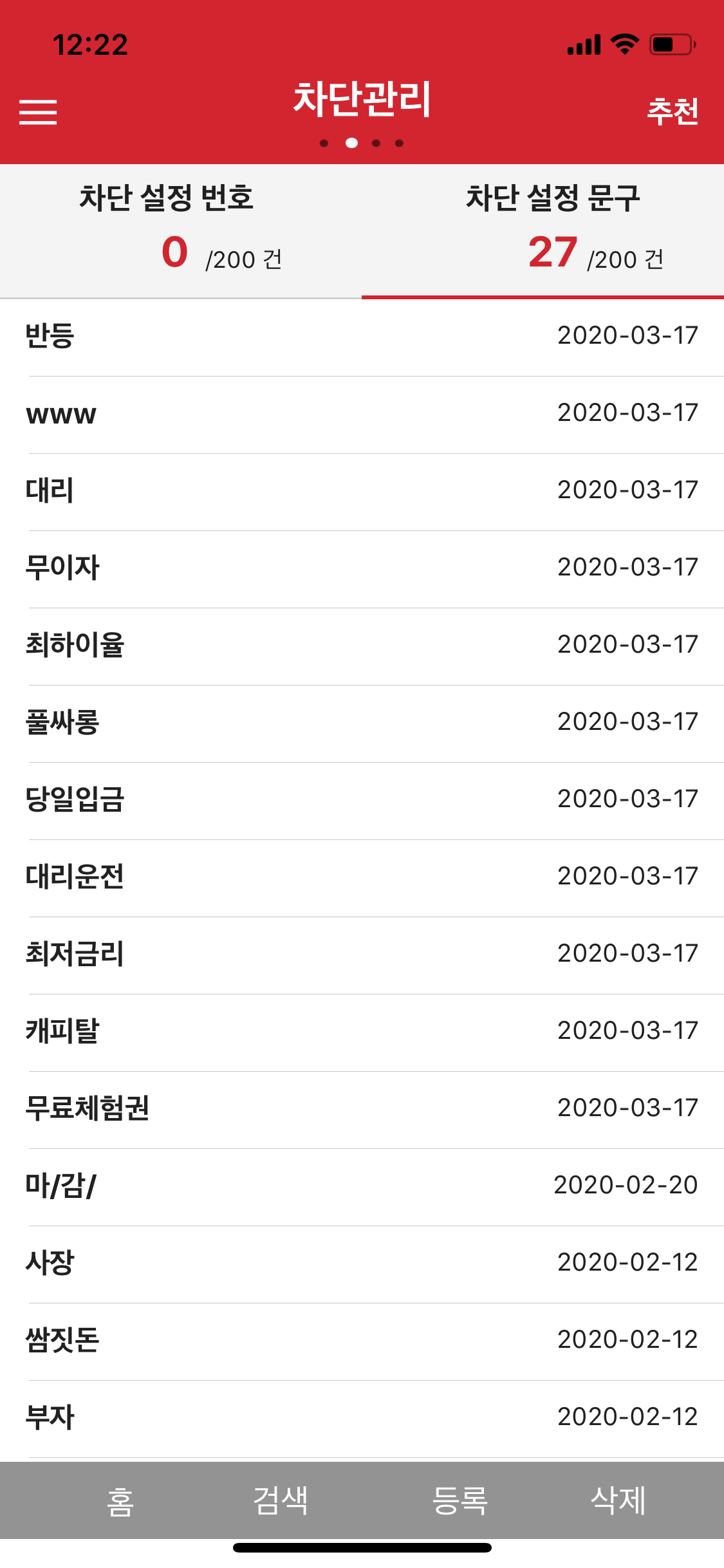 저는 지금 27개를 지정해놓았네요. 점점 더 고단수로 문자를 보내오기 때문에 차단 문구도 더 추가해야 될 거 같아요!