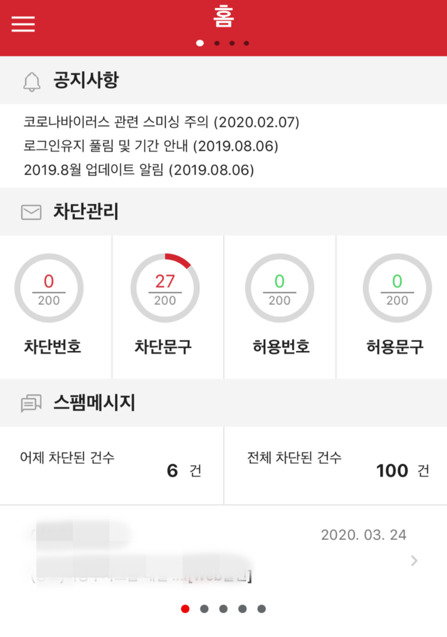 어제만 해도 6건이 차단되었네요!! 이렇게 설정을 하였지만 여러 가지 방법으로 아직 수신되는 메시지들이 있어요.