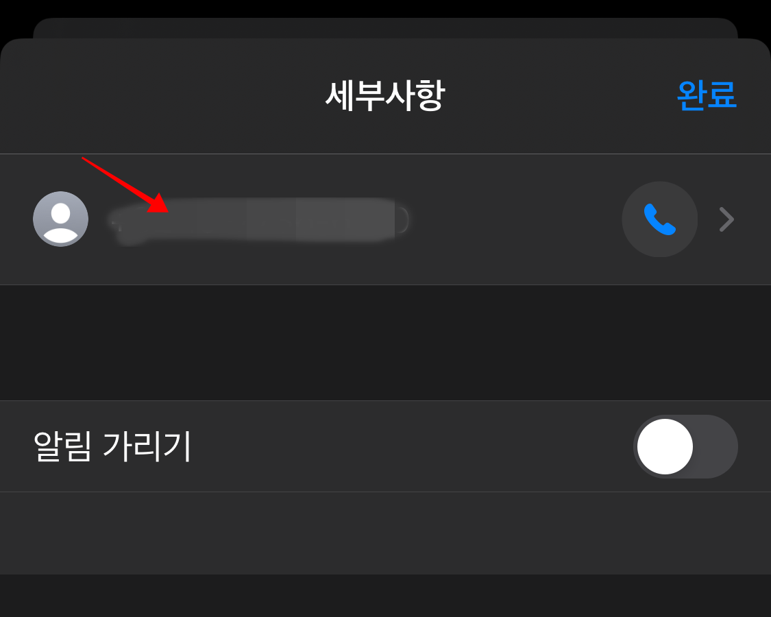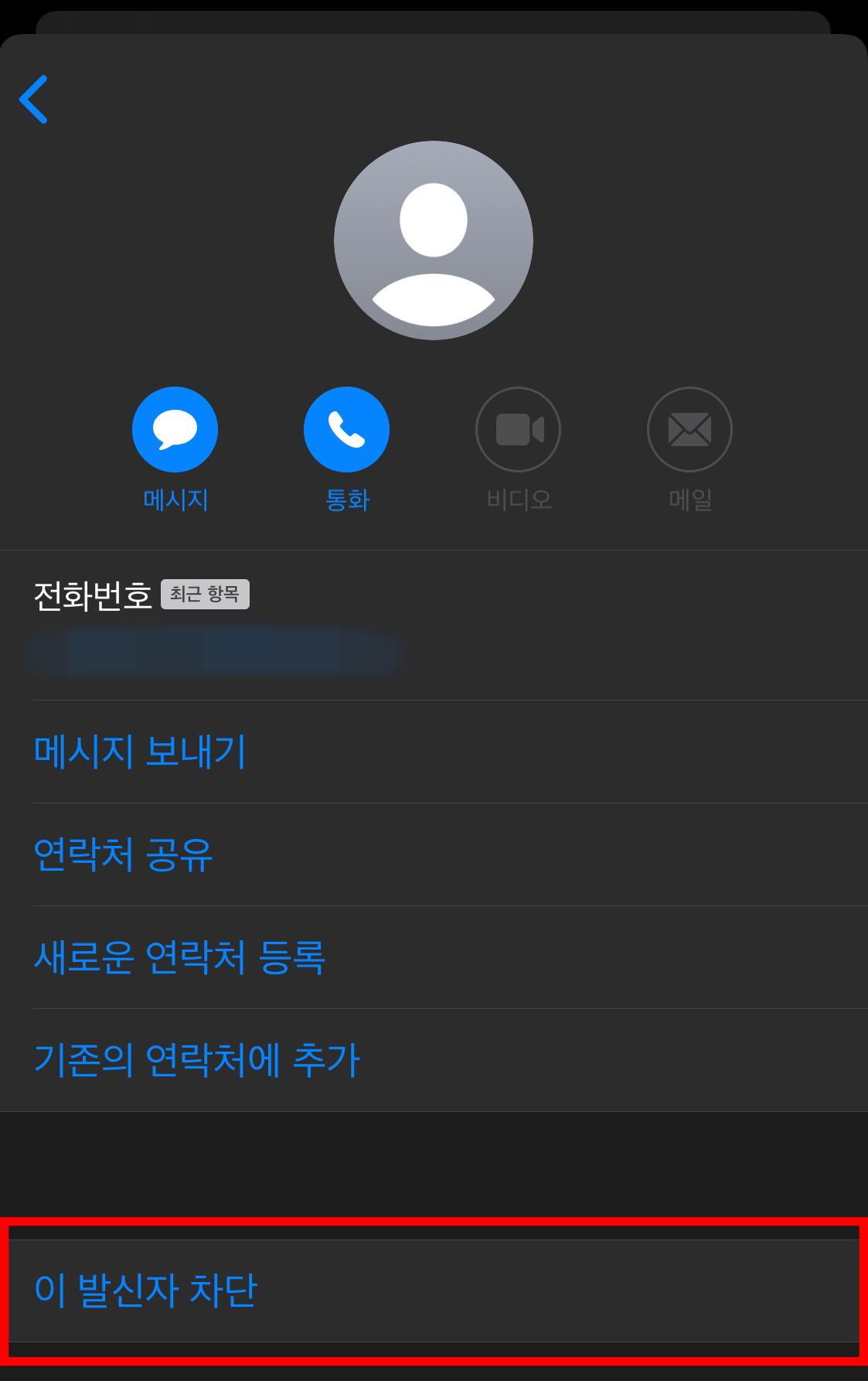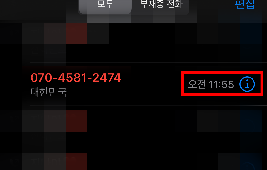 통화목록에서 오른쪽에 i(정보) 버튼을 눌러줍니다. 그러면 아까 문자로부터 차단할 때와 동일한 화면을 확인할 수 있습니다.