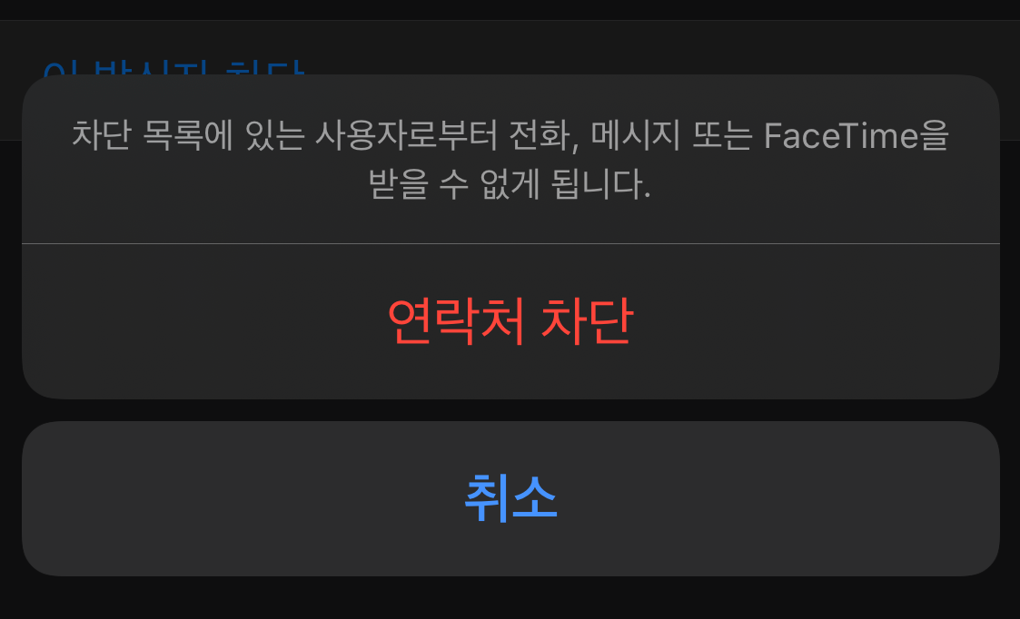 이렇게 경고팝업이 한 번 더 뜨게 됩니다. 연락처 차단을 누르게 되면 이제 해당 전화번호로의 수신은 되지 않습니다!