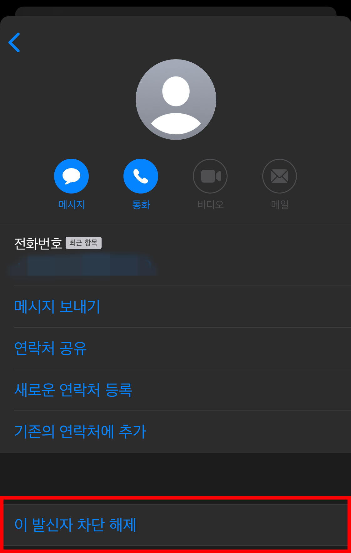 차단된 번호의 경우 이렇게 이 발신자 차단 해제라는 표시로 변화게 됩니다.