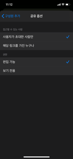 공유 버튼을 누르면 구성원을 추가할 수 있고, 공유 옵션에서 접근할 수 있는 사람 권한을 지정해 줄 수 있습니다.