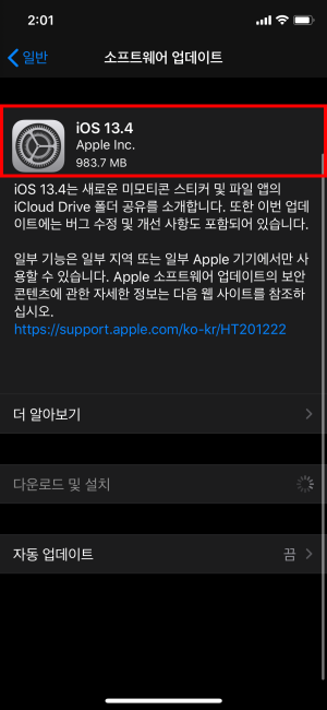 iOS 13.4 업데이트를 시작해 보아요. 용량은 983.7MB로 표시가 되고 있네요. 소프트웨어 버전은 17E255라고 합니다. 모뎀 펌웨어 업데이트로 되어서 LTE, wifi 관련 이슈도 수정되었으니 꼭 업데이트하세요.