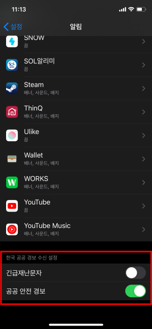 설정 알림 하단 스크롤을 하게 되면 이제는 한국 공공 경보 수신 설정이 2가지로 분할되었습니다. 긴급재난문자, 공공안전경보로 나뉘었습니다.